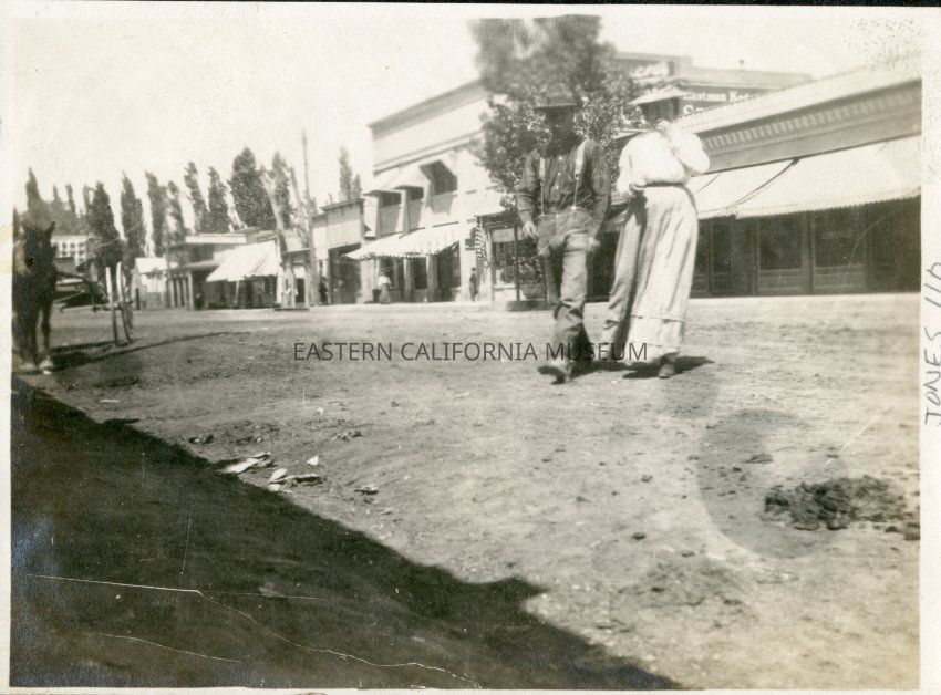 A man and woman walking across Main Street, Bishop, when it was still a dirt roard.