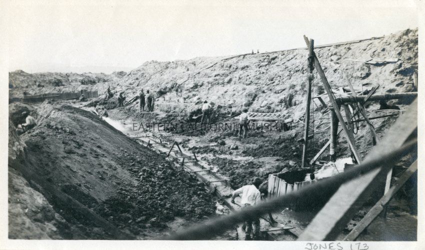 L.A. Aqueduct laborers setting forms and prepping channel for cementing.
