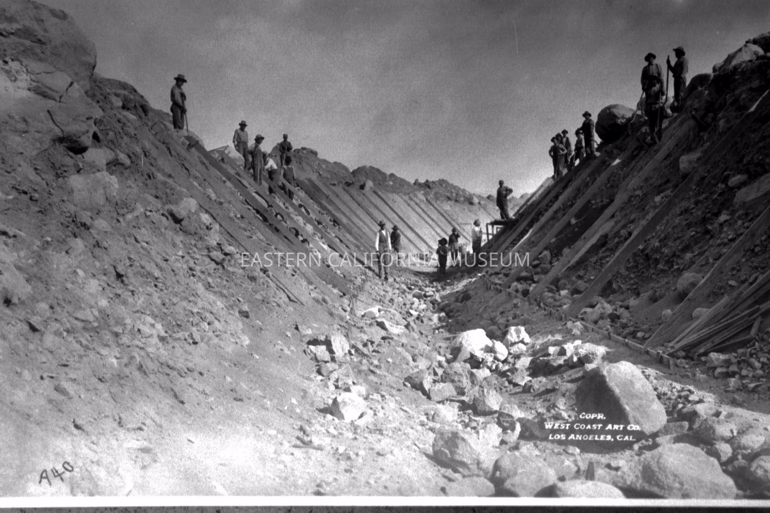 B & W digital scan of LADWP Laborers working on construction of open lined canal section of LA Aqueduct, Owens Valley, possibly near Lone Pine.