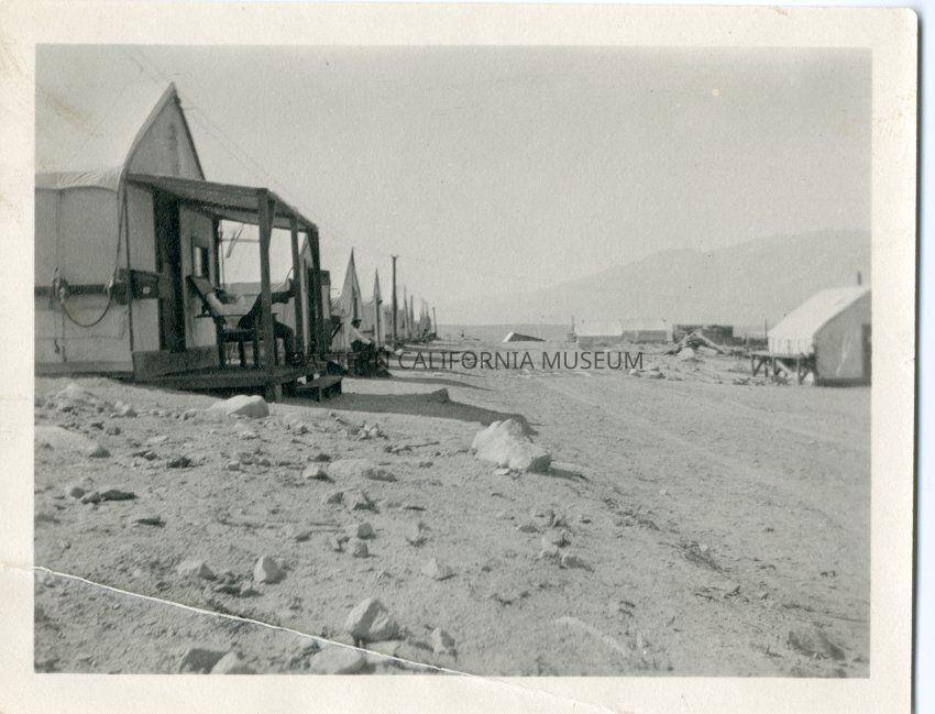 Laborers section of LA Aqueduct construction camp, distinguished by the neat, orderly rows of white canvas tent cabins. Location unknown (possibly in Olancha Division, Lone Pine to Olancha). Note the laborer sitting on porch of first tent cabin.