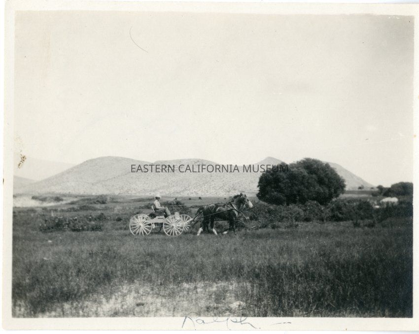 Photo of R. E. Robson in a horse-drawn buggy or buckboard near Georges Creek. The photo was taken looking south toward the Alabama Hills about 1913. Written in blue ink along bottom edge of photo is "Ralph."