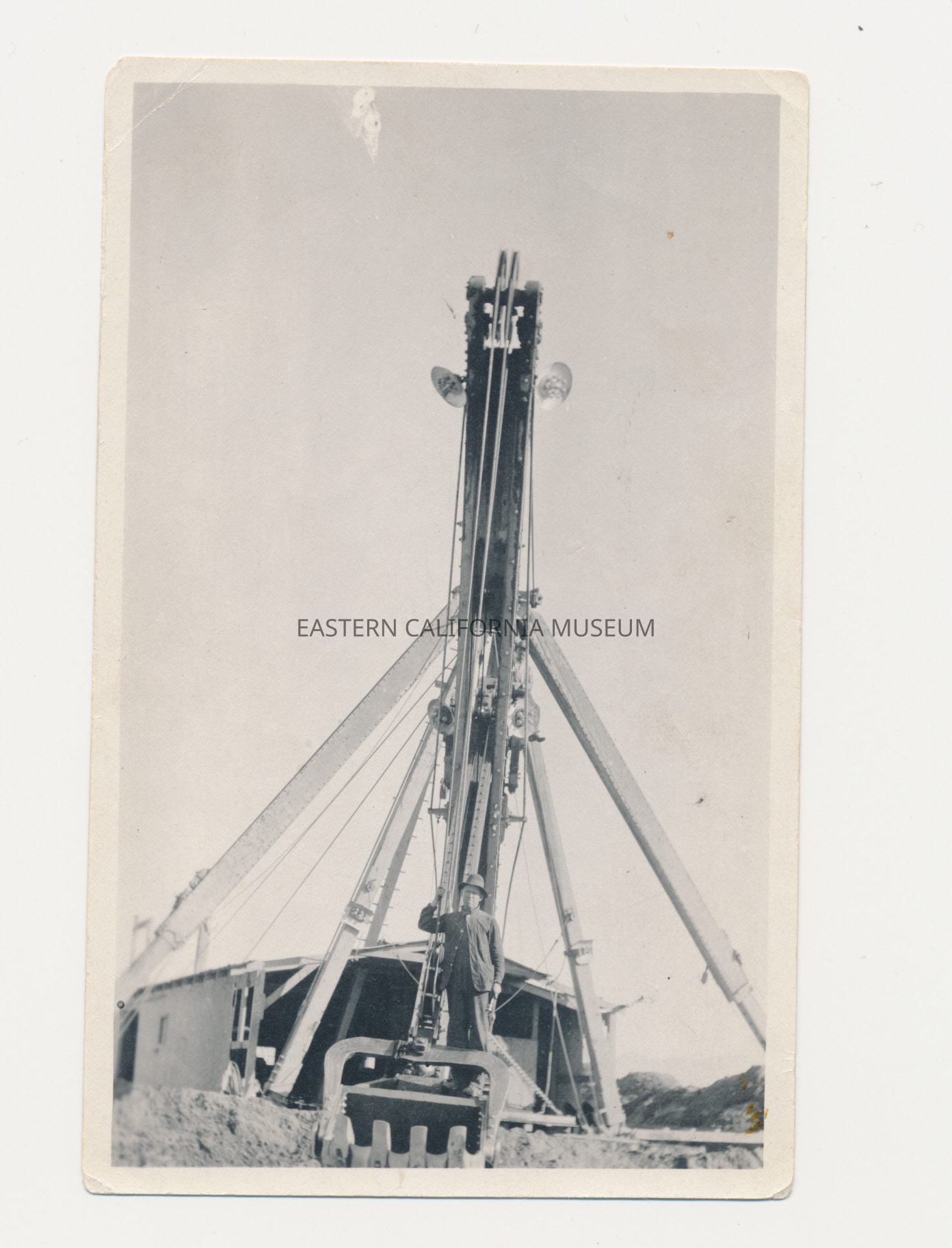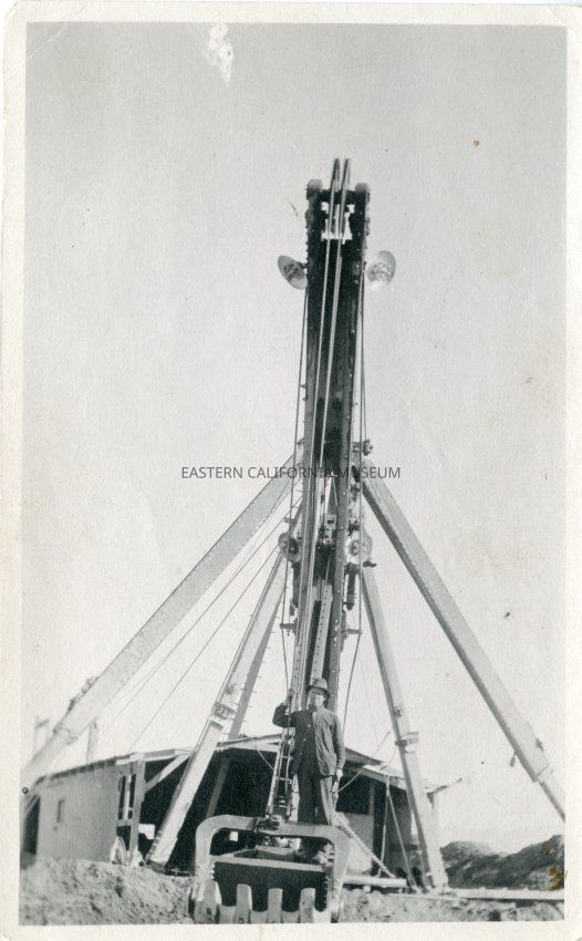 Photo of a man identified as Homer Taylor standing on a dipper dredge floating on an open, unlined section of the L.A. Aqueduct. This and another dredge were used to excavate a majority of the 21 miles of ditch that comprised the Owens Valley Division of the project. The location is somewhere between the Intake and Independence. Note the lights attached on the sides of dredge boom in the center of image.