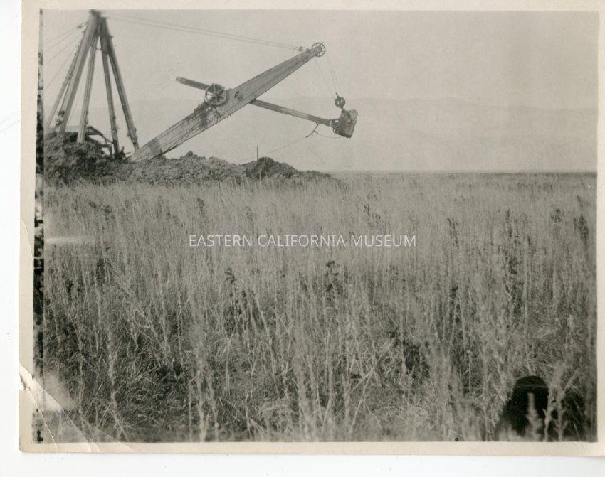 Photo of a LADWP dipper dredge [accession record calls it a steam shovel] carving a channel for the LA Aqueduct through the soft, moist Owens Valley alluvium. These machines excavated 21 miles of open, unlined canal stretching from the Intake to the Alabama Gates.