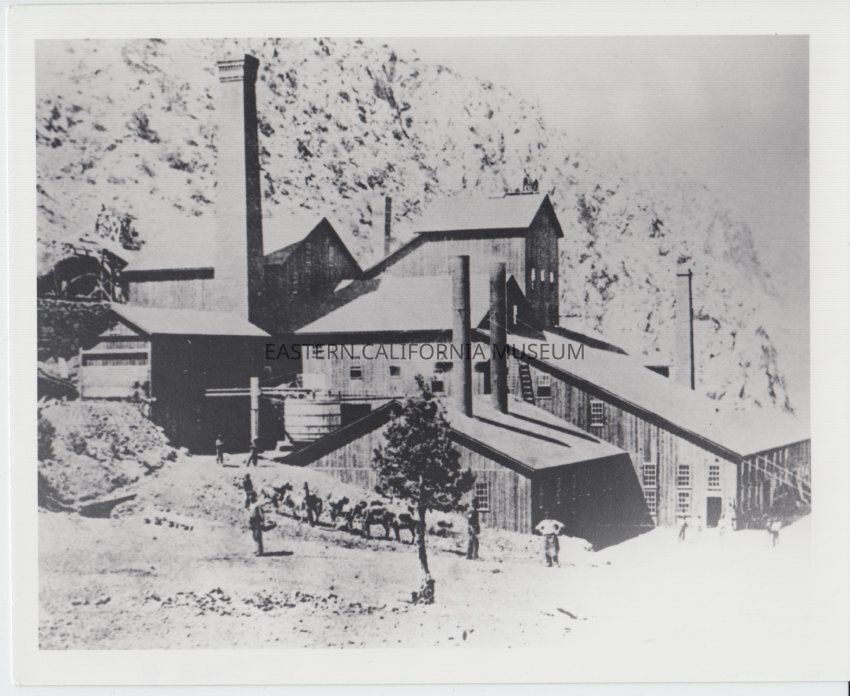 Black and white print of the Panamint City Mine, the Surprise Valley Mill, and the Water Company 20 Stamp Mill, 1875. There is a mule team in the photo.