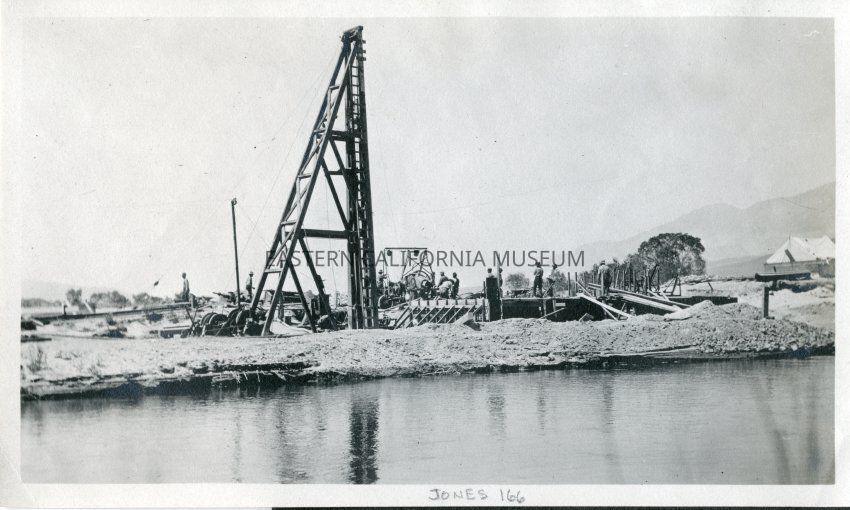 A piledriver operating on the L.A. Aqueduct, possibly at the aqueduct intake. There is a tent cabin at extreme right.