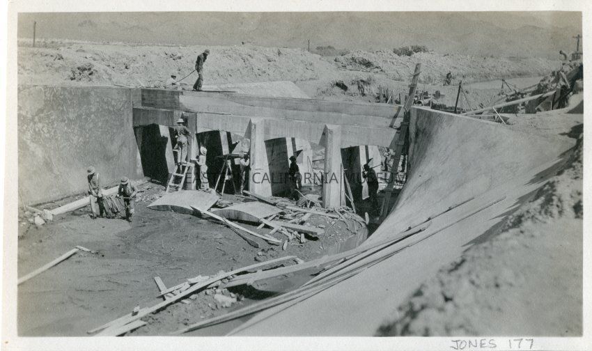 Laborers working on the L.A. Aqueduct intake. There is a man at left on ladder finishing cement.