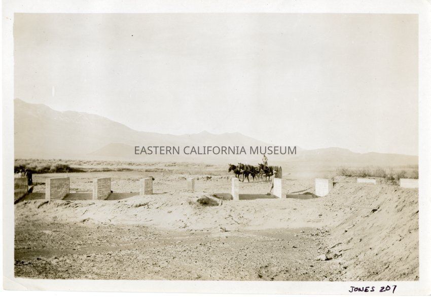 Diversion weir by the L.A. Aqueduct intake. There is a horse team and wagon in the background.