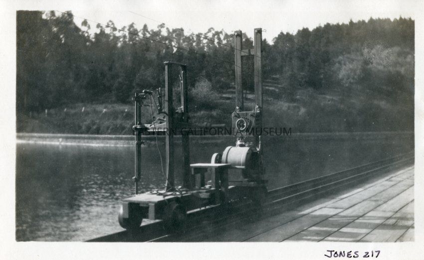 Unidentified machine on rails or tracks traveling across a reservoir or lake.