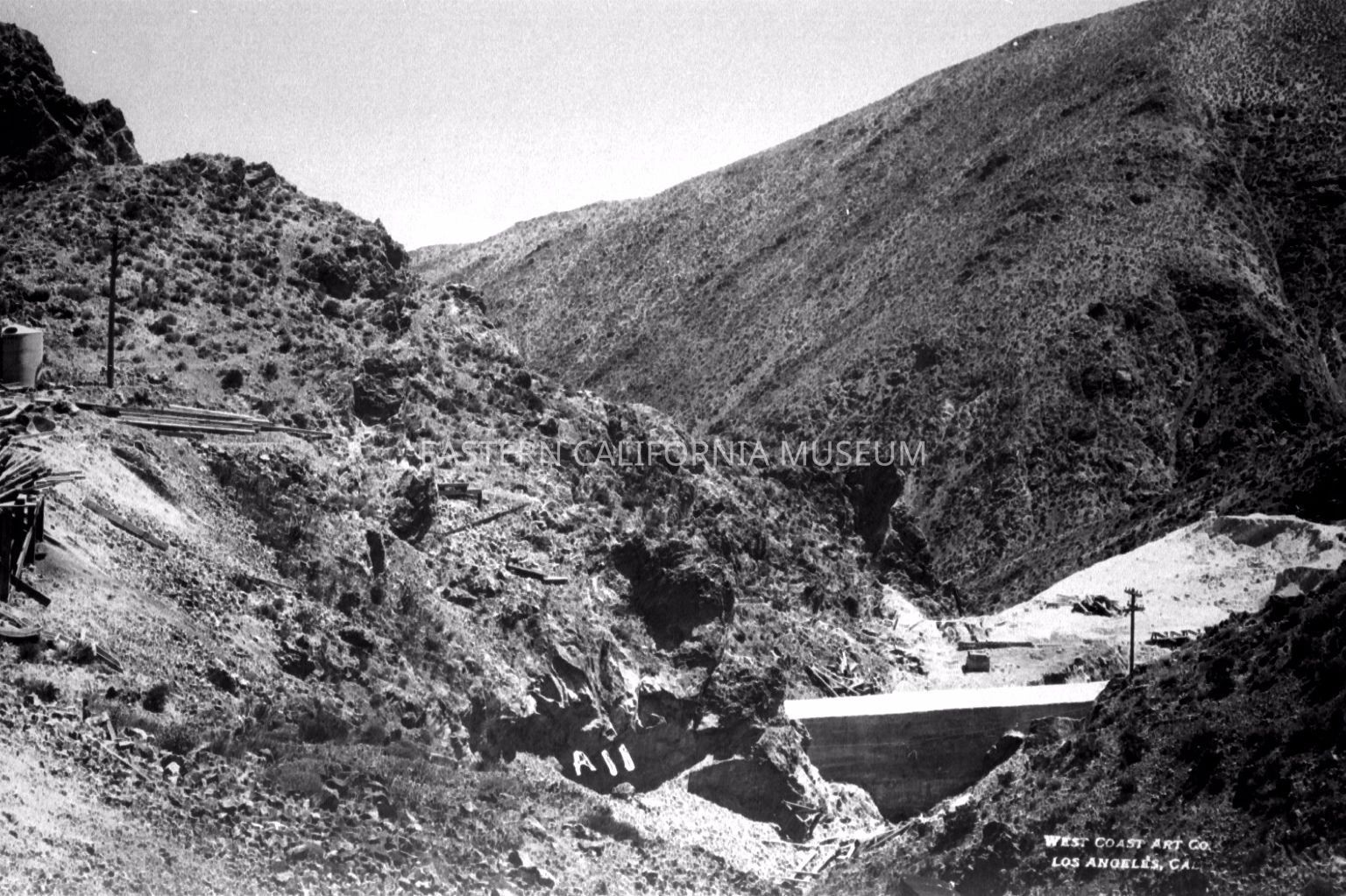 B & W digital scan of section of LA Aqueduct showing a cement, wall-like structure (lower right corner) that may be a portion of Covered Conduit. Roads and telephone poles also visibleCollection