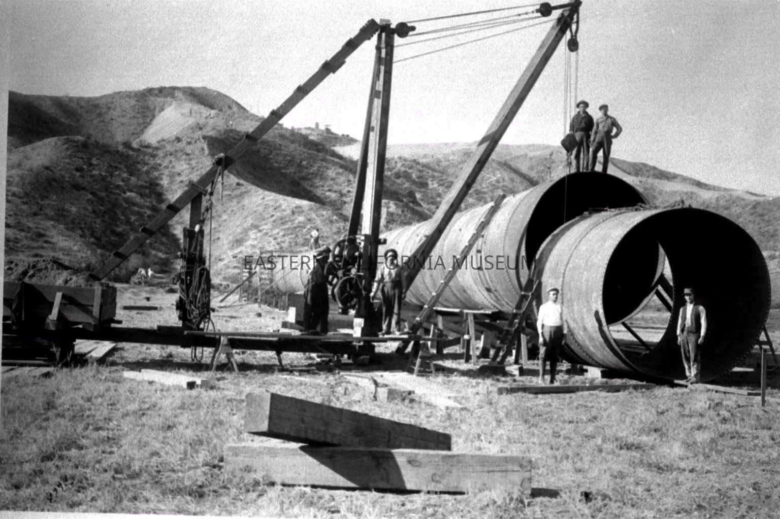 B & W digital scan of LADWP Laborers and Hand Operated Hoist used to raise Pipe Sections into place on LA Aqueduct Siphon.