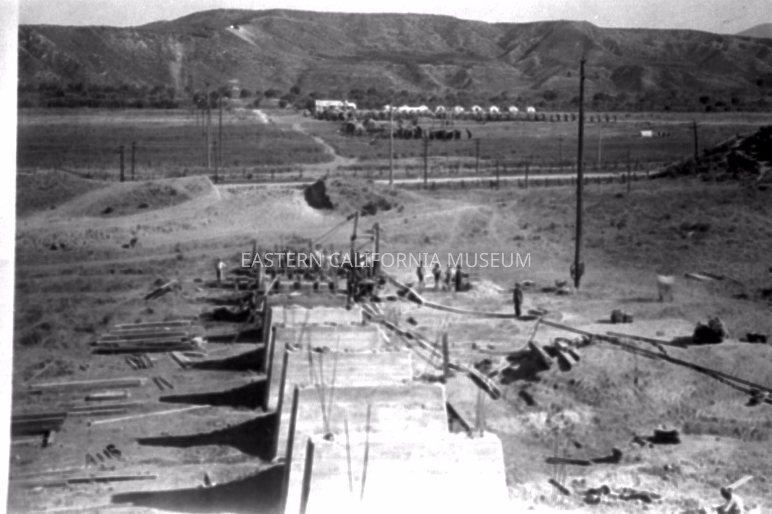B & W digital scan of LADWP Laborers working on Concrete Sections for Soledad Siphon on LA Aqueduct. Location; Soledad Canyon. Aqueduct construction camp (white tent cabins) visible in upper center of image. Image in LA Aqueduct Final Report, pg 215.Collection