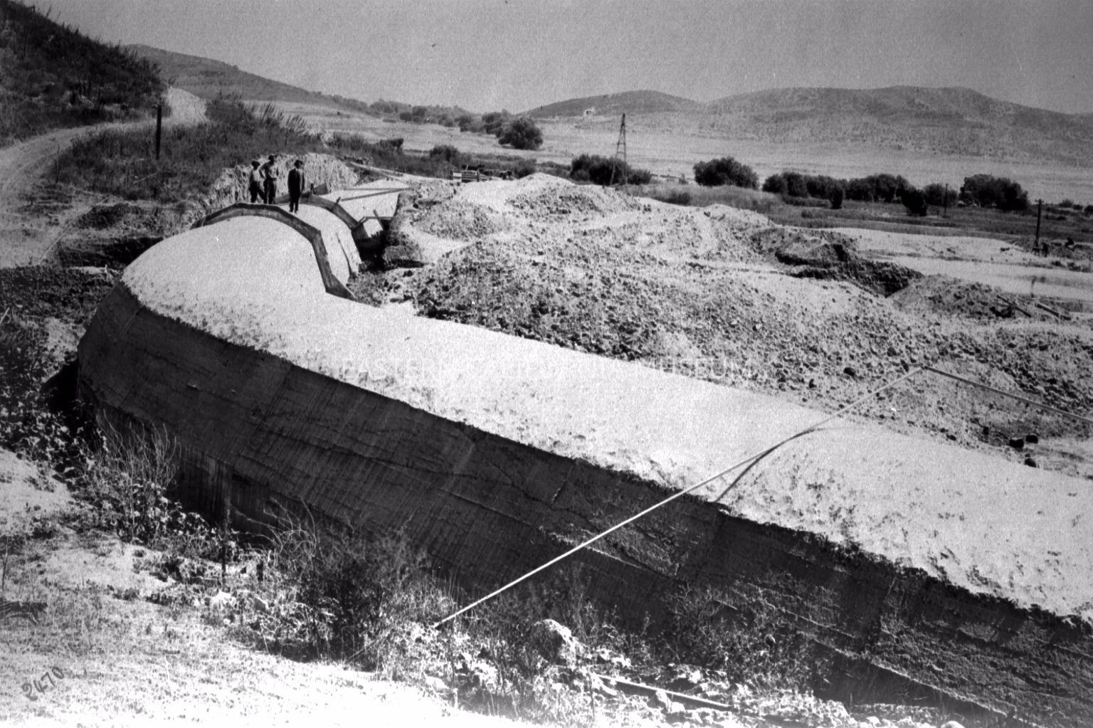 B & W digital scan of Men standing on top of Covered Conduit Section of LA Aqueduct, location unknown.