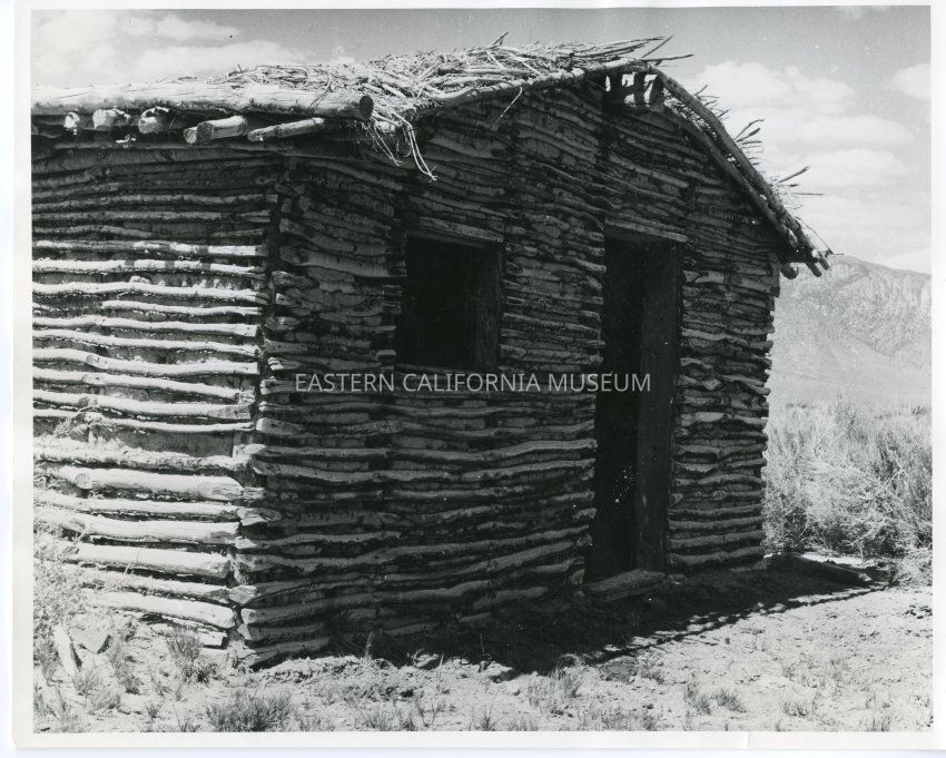B&W. Wood or log cabin with one window and doorway.mountains in background, surrounded by sagebrush.