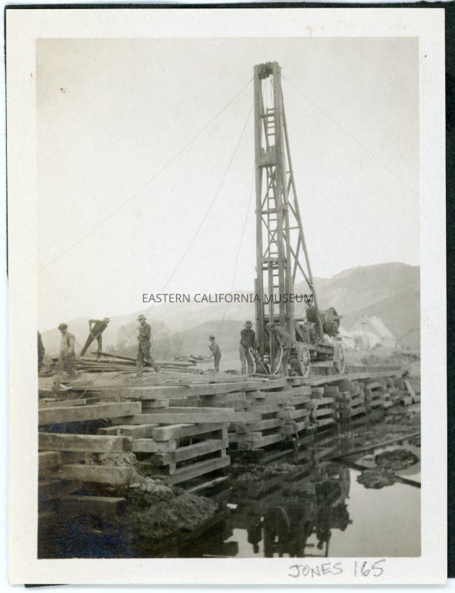 Laborers and machinery (a piledriver?) working on the L.A. Aqueduct.