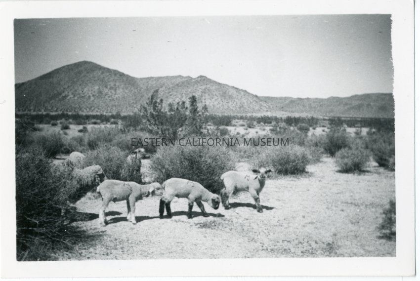 B&W glossy print: 3 lambs, 1 sheep grazing