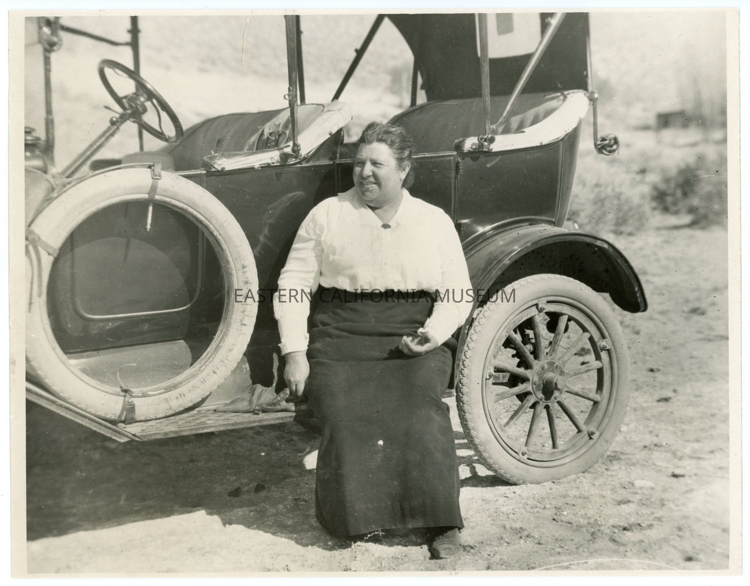 Photo of Mrs. M. A. Clarke sitting on the running board of an early vehicle. She was the County Superintendent of Schools from 1903-1922. She is either from Big Pine, or the photo was taken in Big Pine.