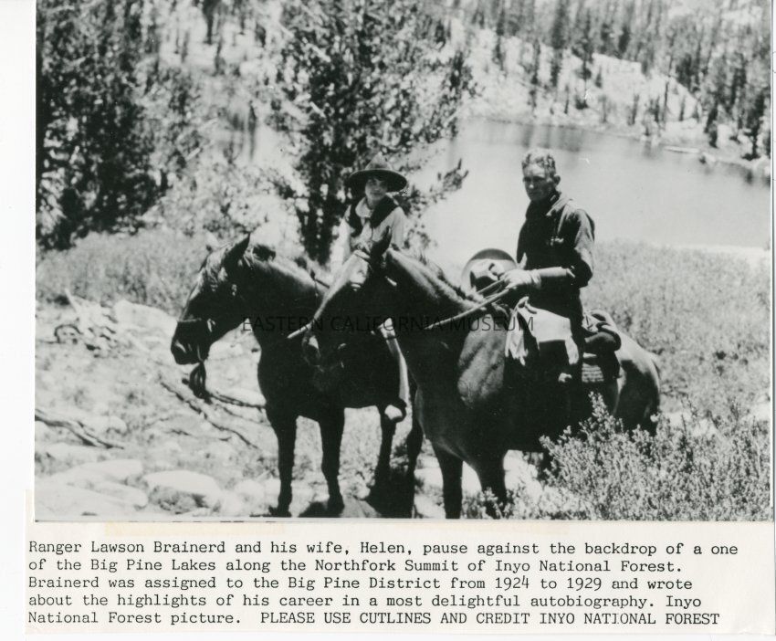 Text attached: Ranger Lawson Brainerd and his wife, Helen, pause against the backdrop of a one of the Big Pine Lakes along the Northfork Summit of Inyo National Forest. Brainerd was assigned to the Big Pine District from 1924 to 1929 and wrote about the highlights of his career in a most delightful autobiography. Inyo National Forest picture.