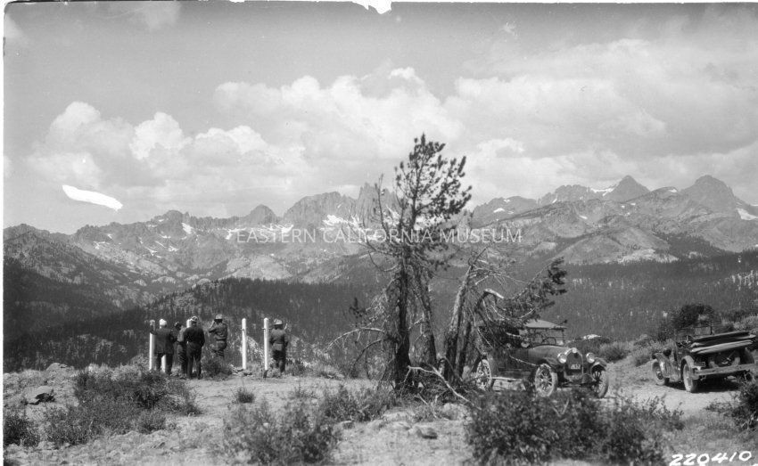 B&W glossy print: several people, 2 early model cars, at Minaret Vista, near town of Mammoth Lakes
