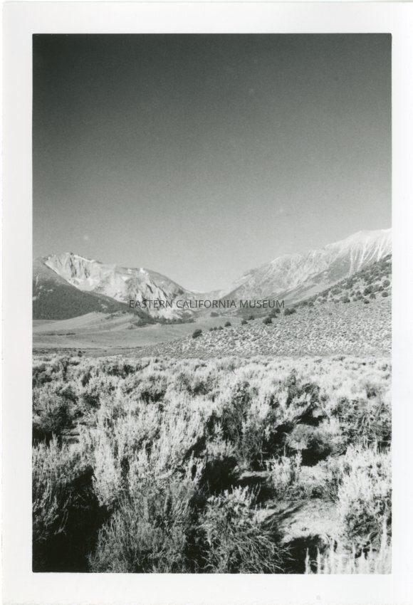 B&W glossy print: sagebrush with mountains in background