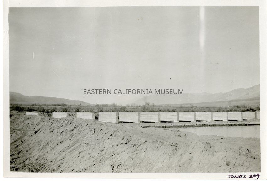 Diversion weir constructed to divert the Owens River from its natural channel into the L.A. Aqueduct intake. Photo taken looking north up the Owens Valley.Collection