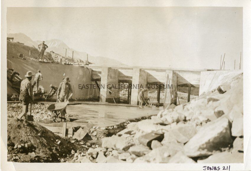 Laborers working on the downstream side of the L.A. Aqueduct intake. They are pouring and finishing cement.