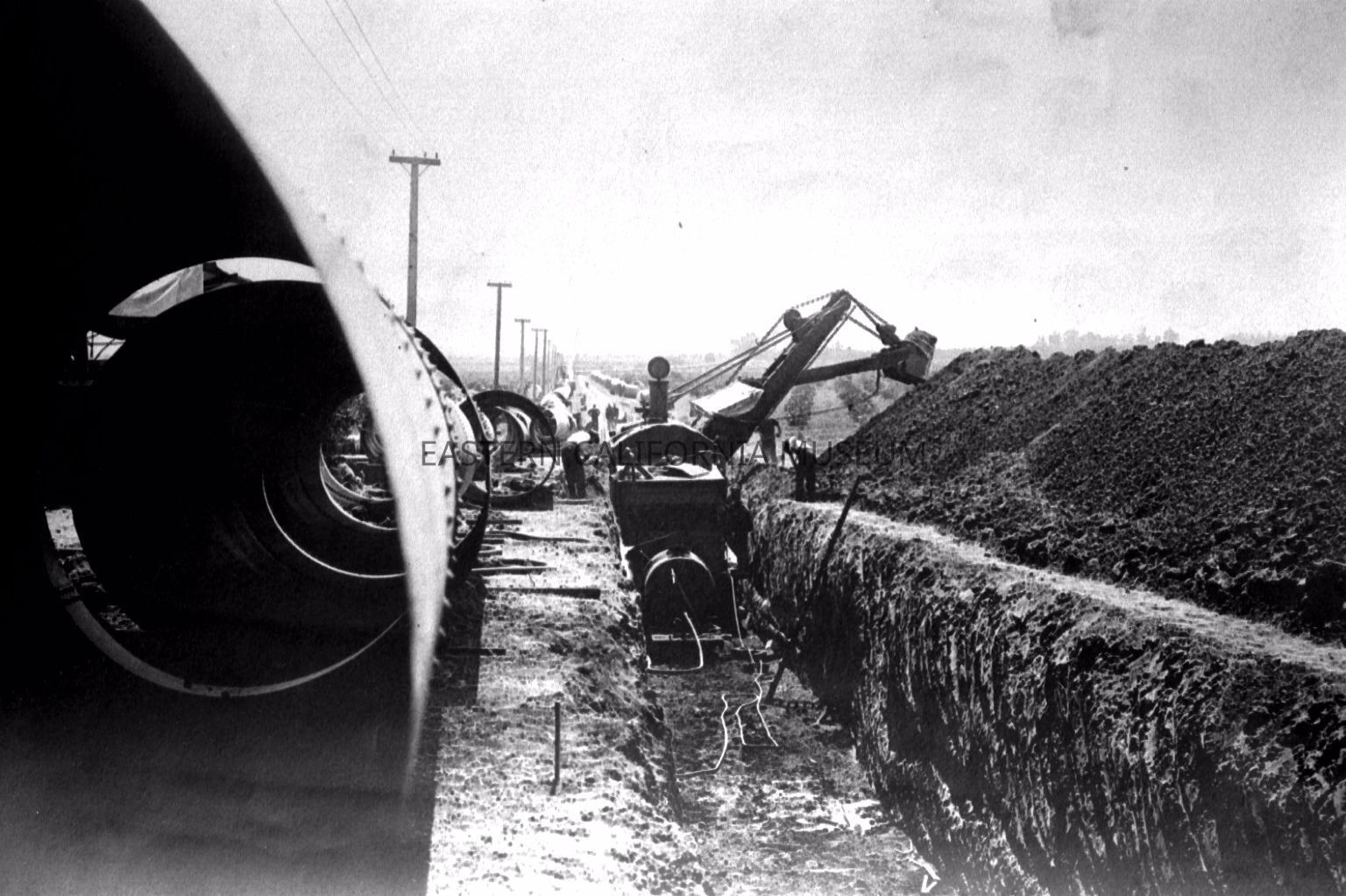 B & W digital scan of Marian Steam Shovel excavating Trench for LA Aqueduct Siphon. Pipe sections at left of image will be placed in the trench and backfilled. "The most satisfactory results were obtained on the Aqueduct by laying pipe in a shallow trench that supports about one third of the bottom circumference of the pipe. This can be best done on gently slopes where the soil conditions are favorable." from LA Aqueduct Construction Final Report, Construction of Siphons, pg. 199.Collection