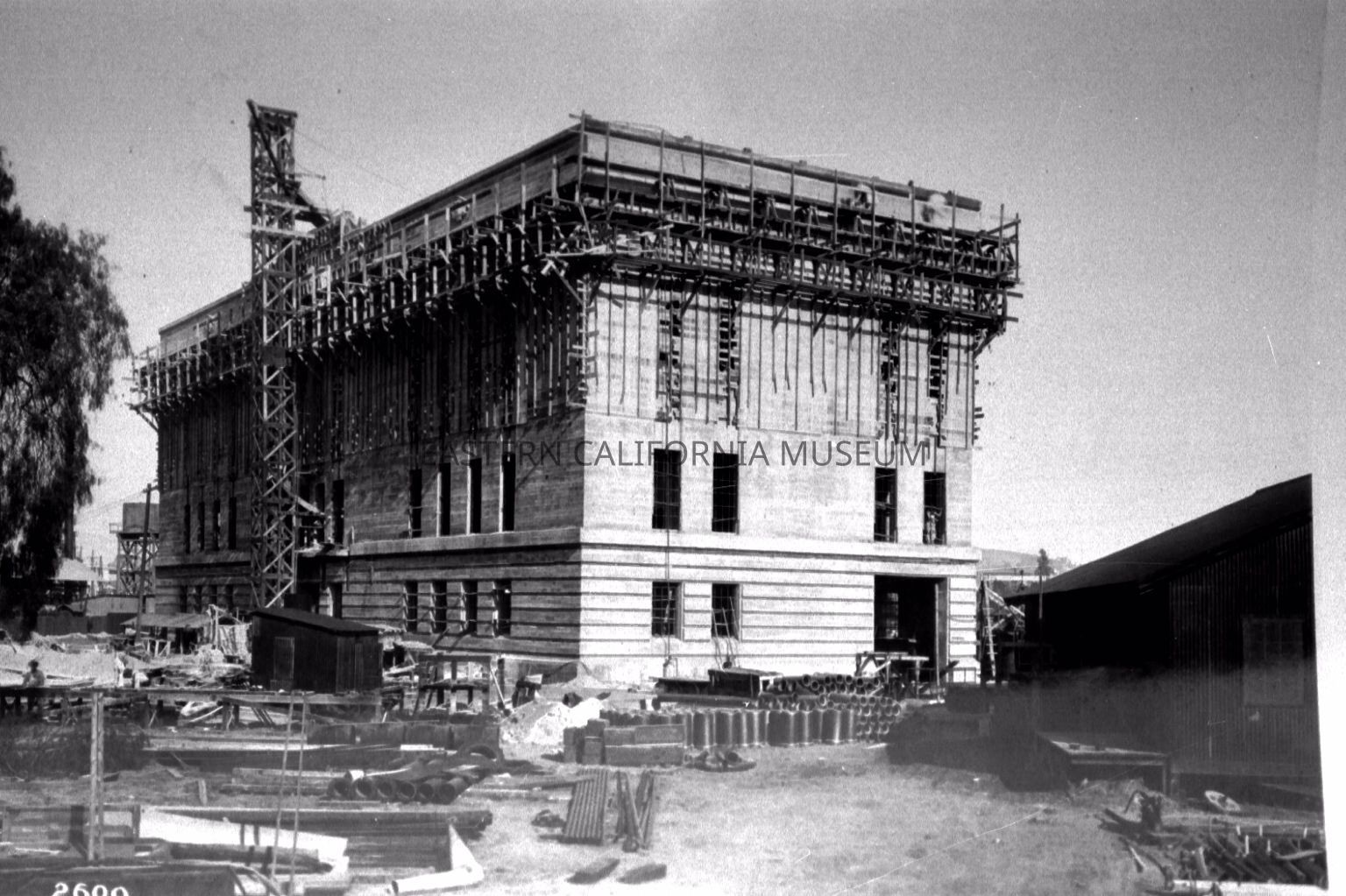 B & W digital scan of LADWP's San Francisquito Power Plant under construction. The plant would eventually generate electricity from the falling water of the LA Aqueduct. The plant was constructed by the Division of Aqueduct Power and Light.Collection