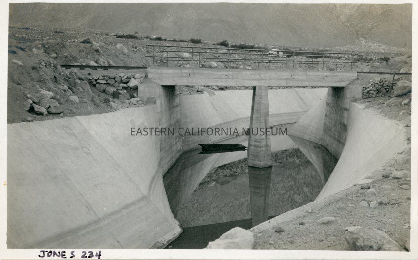 Postcard showing the Southern Pacific broad gauge railroad line crossing the L.A. Aqueduct at Olancha.