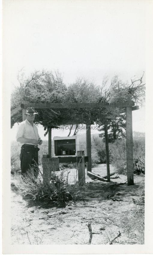 Photo of a man with a recording device (temperature or seismograph?) that is part of a survey by the California State Department of Public Works, Division of Highways.