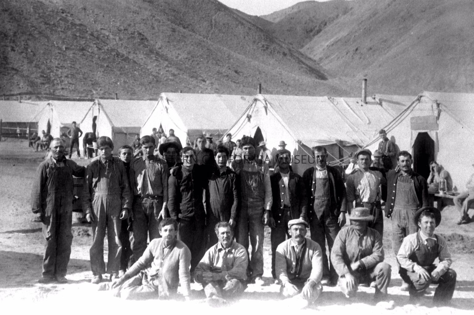 B & W digital scan of LA Aqueduct Workmen posing in front of Tent Cabins, LA Aqueduct Construction Camp, location unknown. Note Vent Pipes from Wood Burning Stoves providing heat during winter months. "The City furnished sleeping tents and bunks for the laborers, but the men supplied thier own bedding. Married men, with their families in the field, were supplied either with houses or individual frame tents with floors." -from LA Aqueduct Construction, Final Report, pg. 256.Collection
