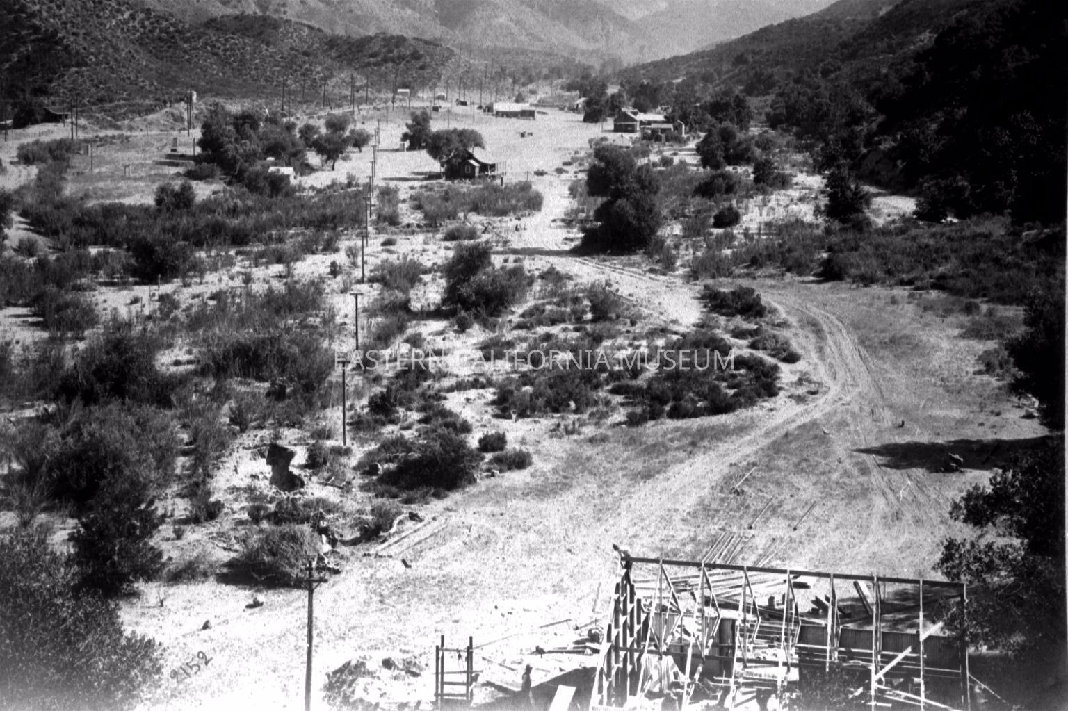 B & W digital scan of LADWP Laborers working on structure with LA Aqueduct Construction Camp in background. Transmission line running through image.Collection