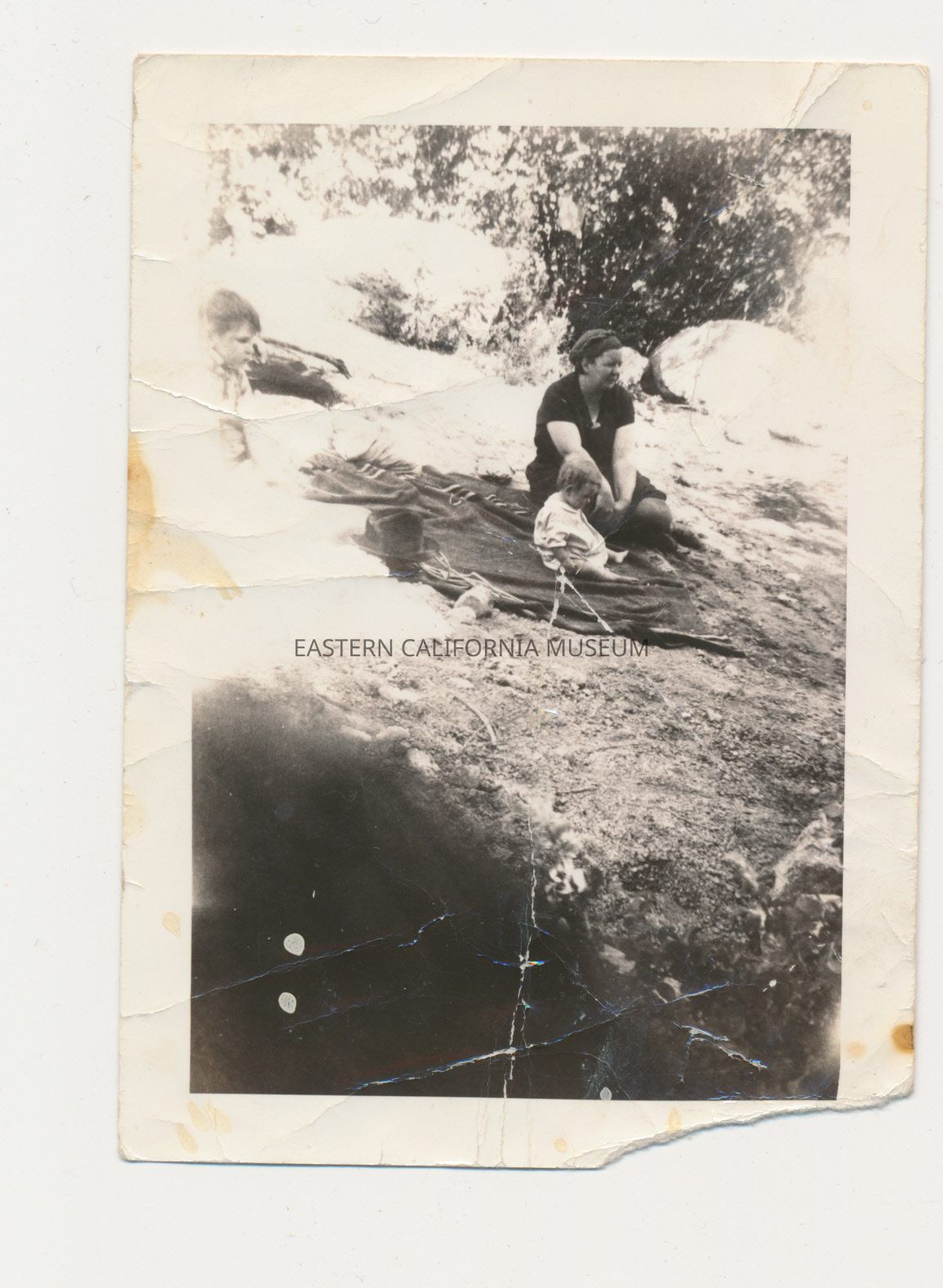 Photo of Ora Drew Smith and baby Virgil Dale Smith sitting on a picnic blanket in 1932. There is another young boy standing to the left.