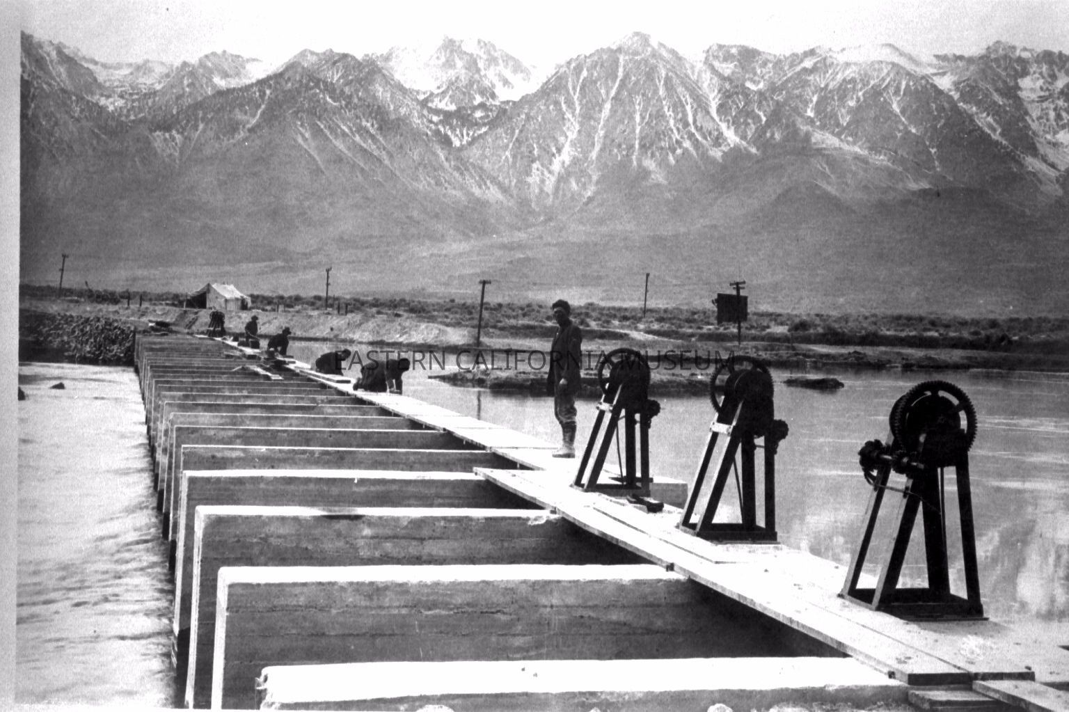 B & W digital scan of LADWP Laborers working on Diversion Weir and Sluiceway Structure (part of Intake facility) that diverts Owens River from its original channel into the LA Aqueduct Aqueduct. "There are three radial Sluice Gates at each end of the Diversion Weir, 8' wide and 8 1/2' high. They are built upon steel sheet piling and concrete, with concrete abutments. These gates may be opened to pass unusual floods or to sluice out the river channel immediately in front of the intake of the canal. The overall length of Weir structure is 324'. from, LA Aqueduct Construction, Final Report, 1916, pg 131.Collection