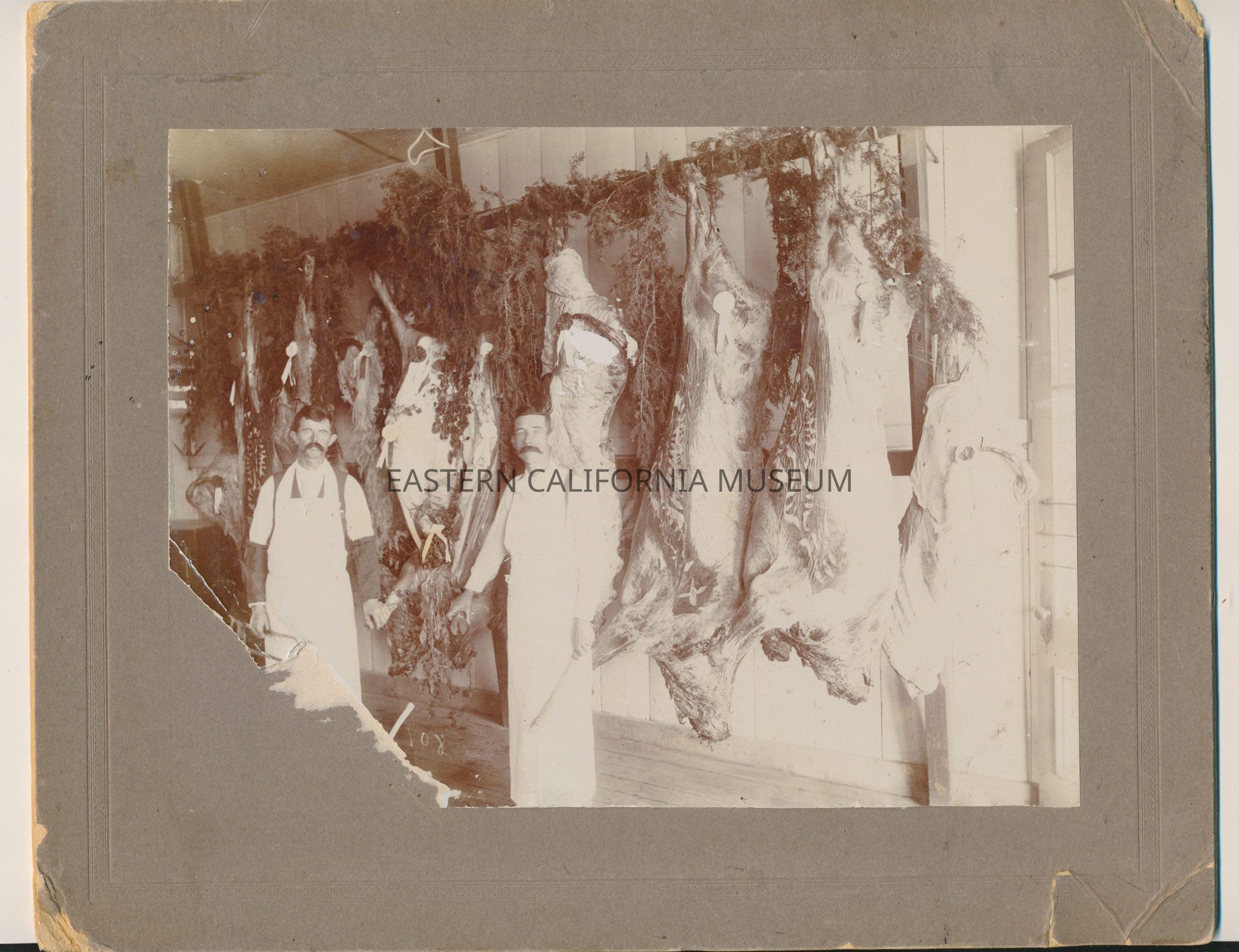 Written in pencil on reverse: David S. Drew, Ed Weaver, butcher shop, San Pedro.