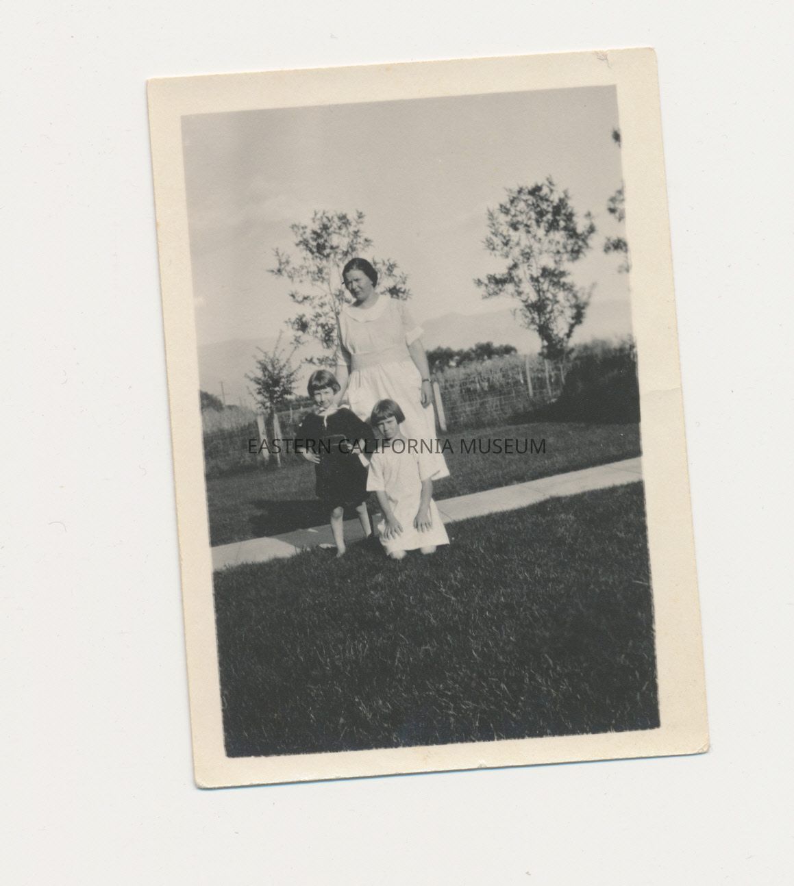 Photo of a woman with two little girls standing on a grassy lawn. Young trees, mountains in background.