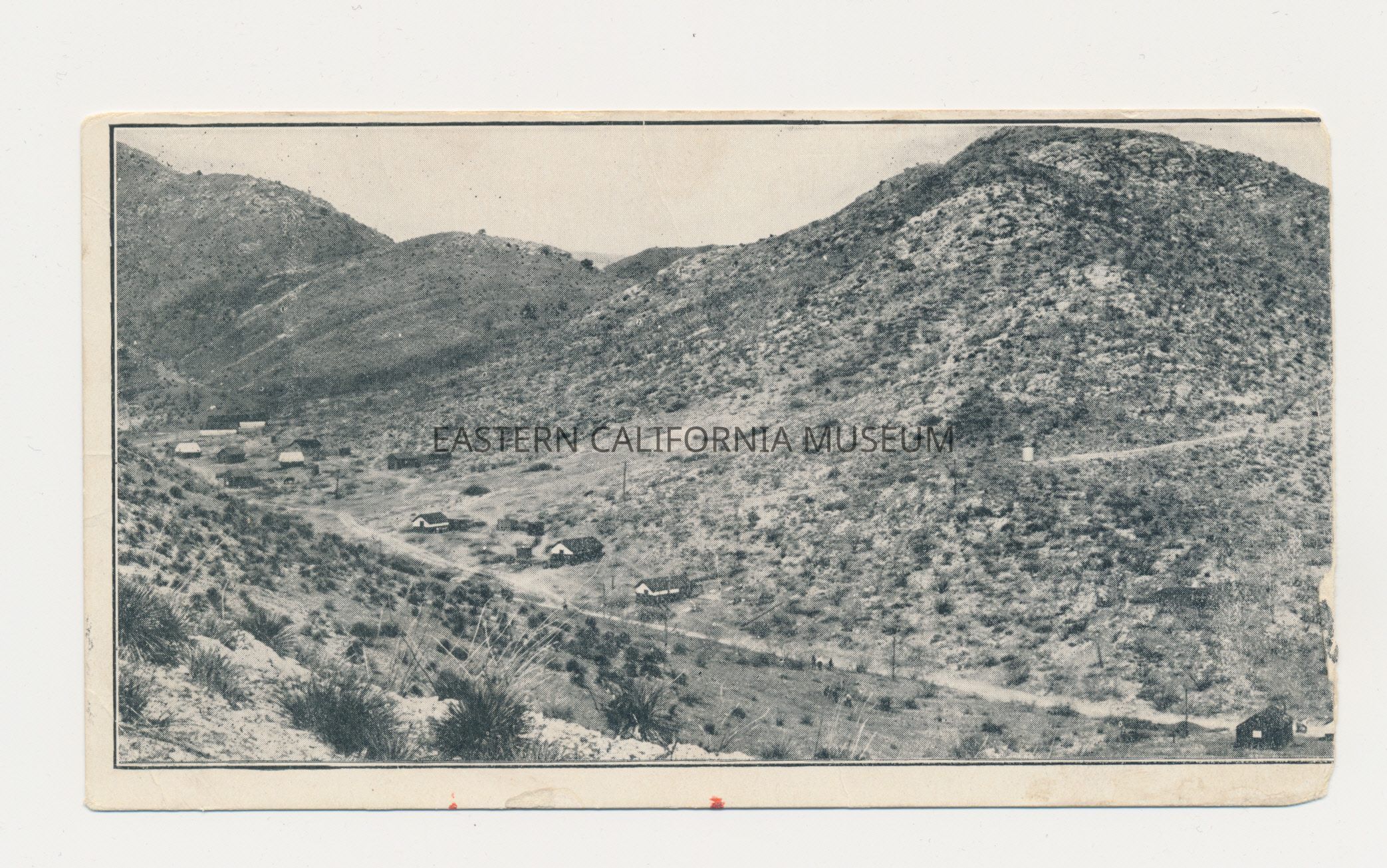Print of a few buildings nestled in a valley. This photo appears to be the far left edge of a panorama taken about 1909 by the West Coast Art Co. of Los Angeles, CA.