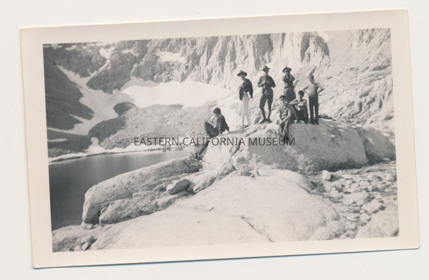 1991.13.1.44--Group of seven boys standing on rocks beside a mountain lake. There are patches of snow in the background. Written in pencil on reverse: Big Meysan Lake.