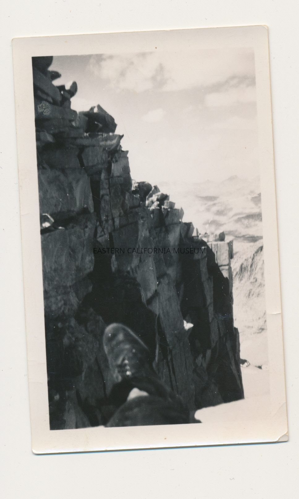 1991.13.1.47--Vertical photo of a foot hanging over the edge of the cliff on the summit of Mt. Whitney. Written in pencil on reverse: Mt. Whitney trip.