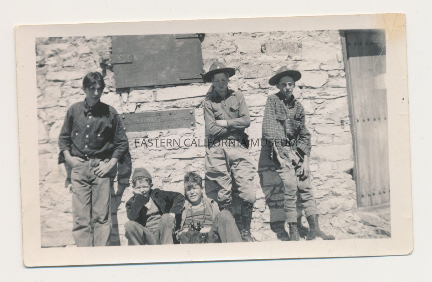 1991.13.1.48--Photo of five boys leaning against the side of the Smithsonian hut on the summit of Mt. Whitney. Two of the boys are sitting down, most of them look exhausted. An enlargement of this photo has the following information written in pencil on reverse: Lone Pine. Jones, Keith D. Drew, Claude V. Drew, Marvin Donald Smith, Clyde Goodwin (killed accident after grad, model pickup accident). Top Mt. Whitney.Collection