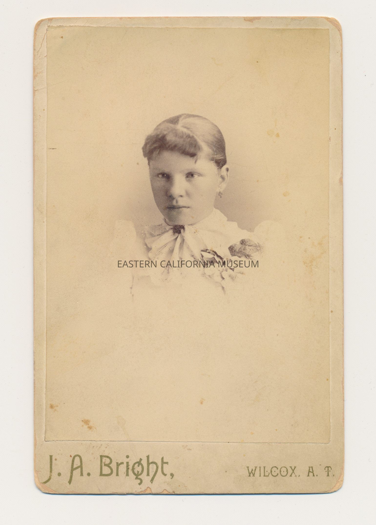 Mounted photo of a young who is identified on the reverse as Virgie Roberts [Ora Virginia Roberts] at age 13. The photographer was J. A. bright of Wilcox, A.T. [Willcox, Arizona Territory]. Age indicates this photo was taken circa 1914.
