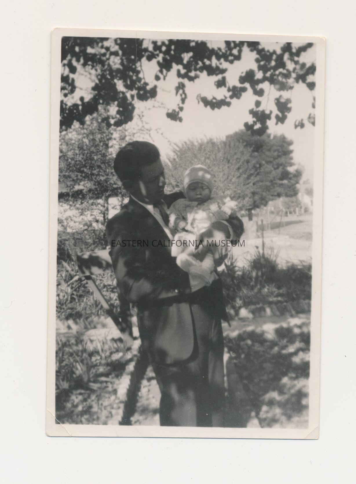 1991.13.1.54--Man holding a baby in a yard. Written in blue ink on reverse: "Two months." Written in pencil on reverse: "William David Drew, (Herbert) David Drew, about 1938."