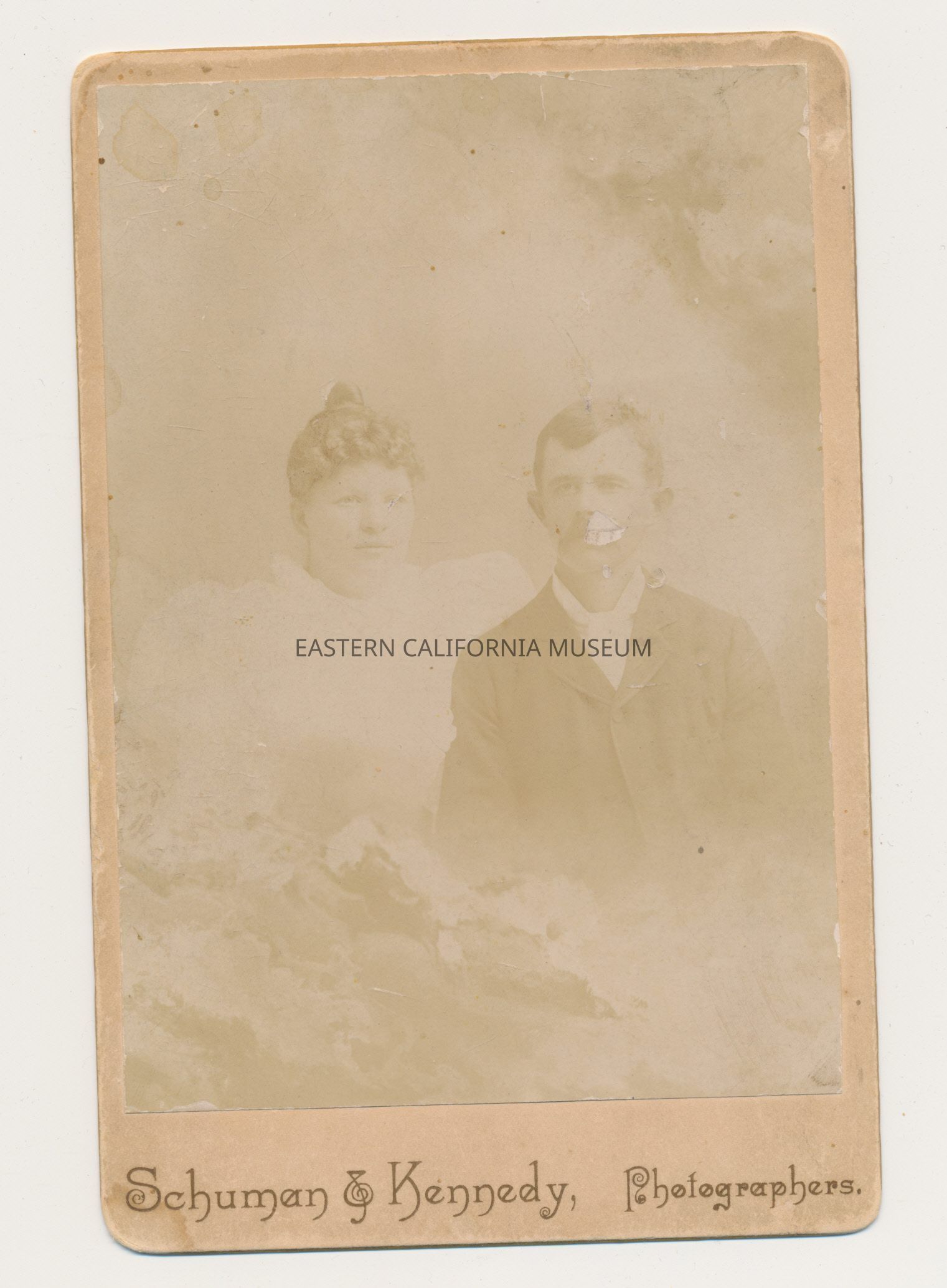 Mounted studio portrait of a man and woman who have been identified on the reverse as Ora Virginia Roberts Drew and David Stuart Drew on their wedding day in Willcox, AZ, June 23, 1897. The mounting is from Schuman & Kennedy, Photographers. Photo is badly faded.Photograph Details