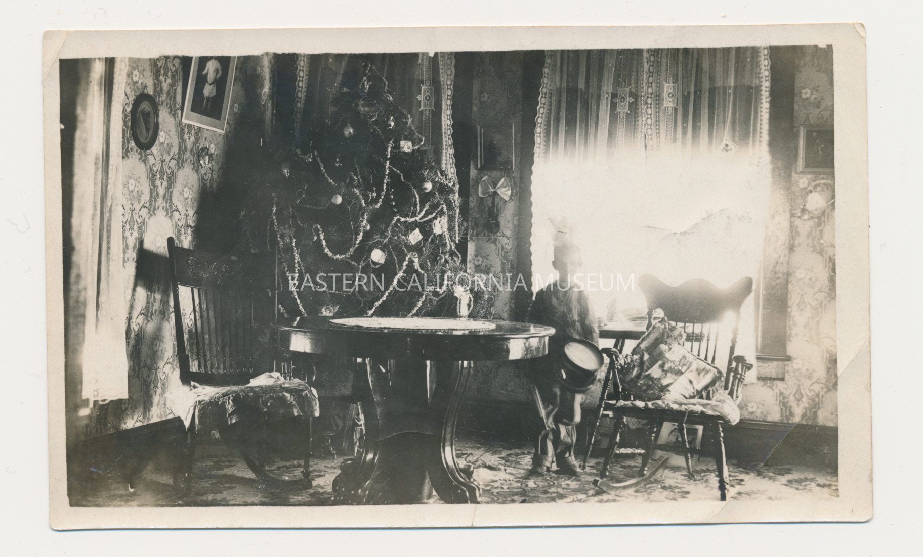 Interior photo of a Christmas tree, table with two chairs, and young boy (with a drum?).