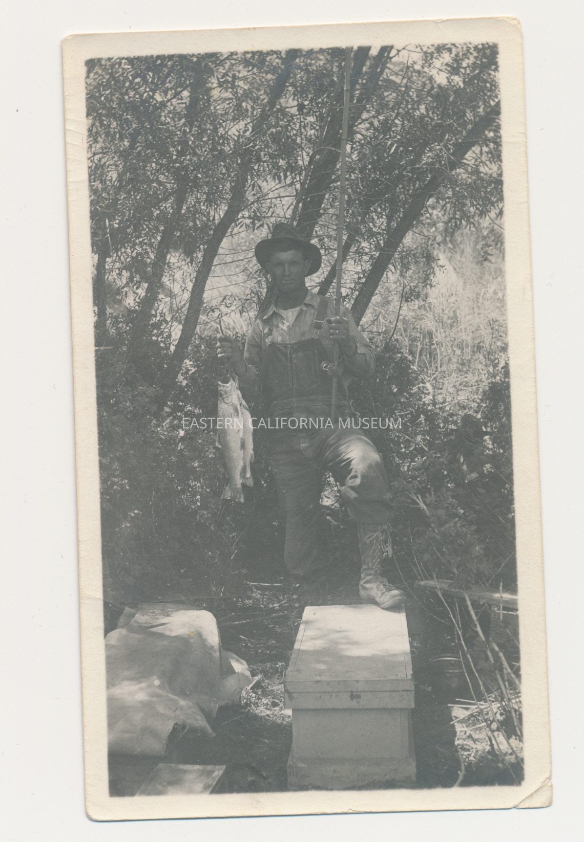 Photo of a kneeling man wearing overalls holding a fishing pole and stringer of large trout.