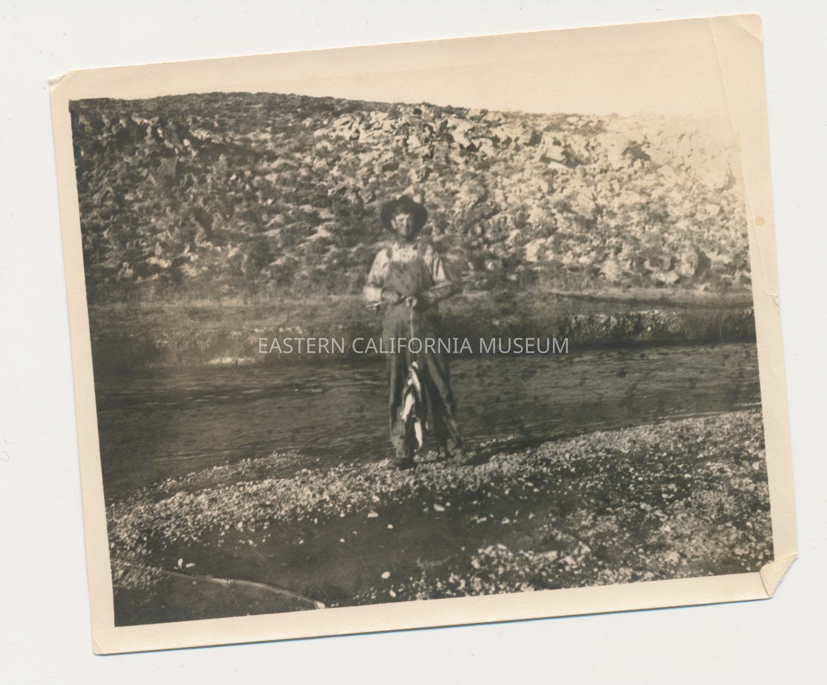 Photo of a man wearing overalls holding a fishing pole and stringer of large trout. There is a river and hillside in the background.