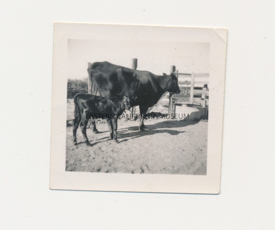 Small square photo of a cow and calf. Written in black ink on reverse: Summer '48.