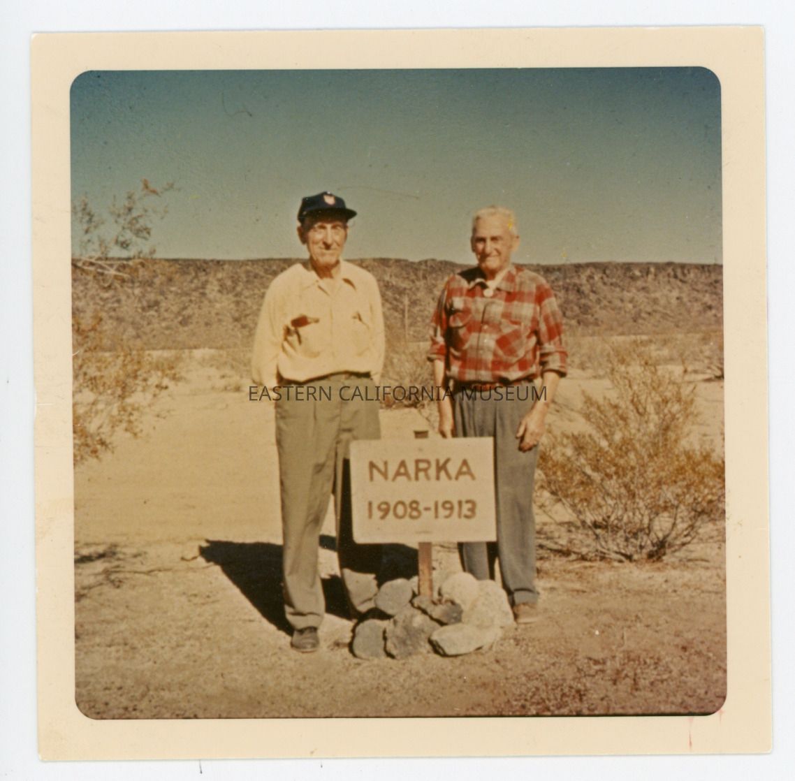 Color photo of two men standing by a sign that says, "Narka 1908-1913." The man on the left is identified as Emil Breitkrentz. The photo may have been taken in July 1966.