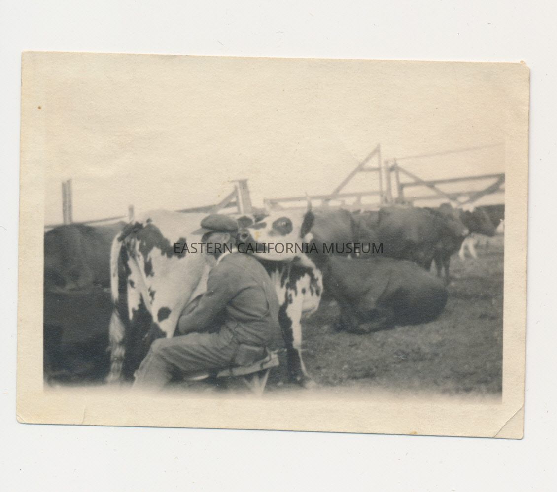 Photo of a man sitting on a stool milking a cow, who has turned her head to lick his neck. There are many more cows in the background.