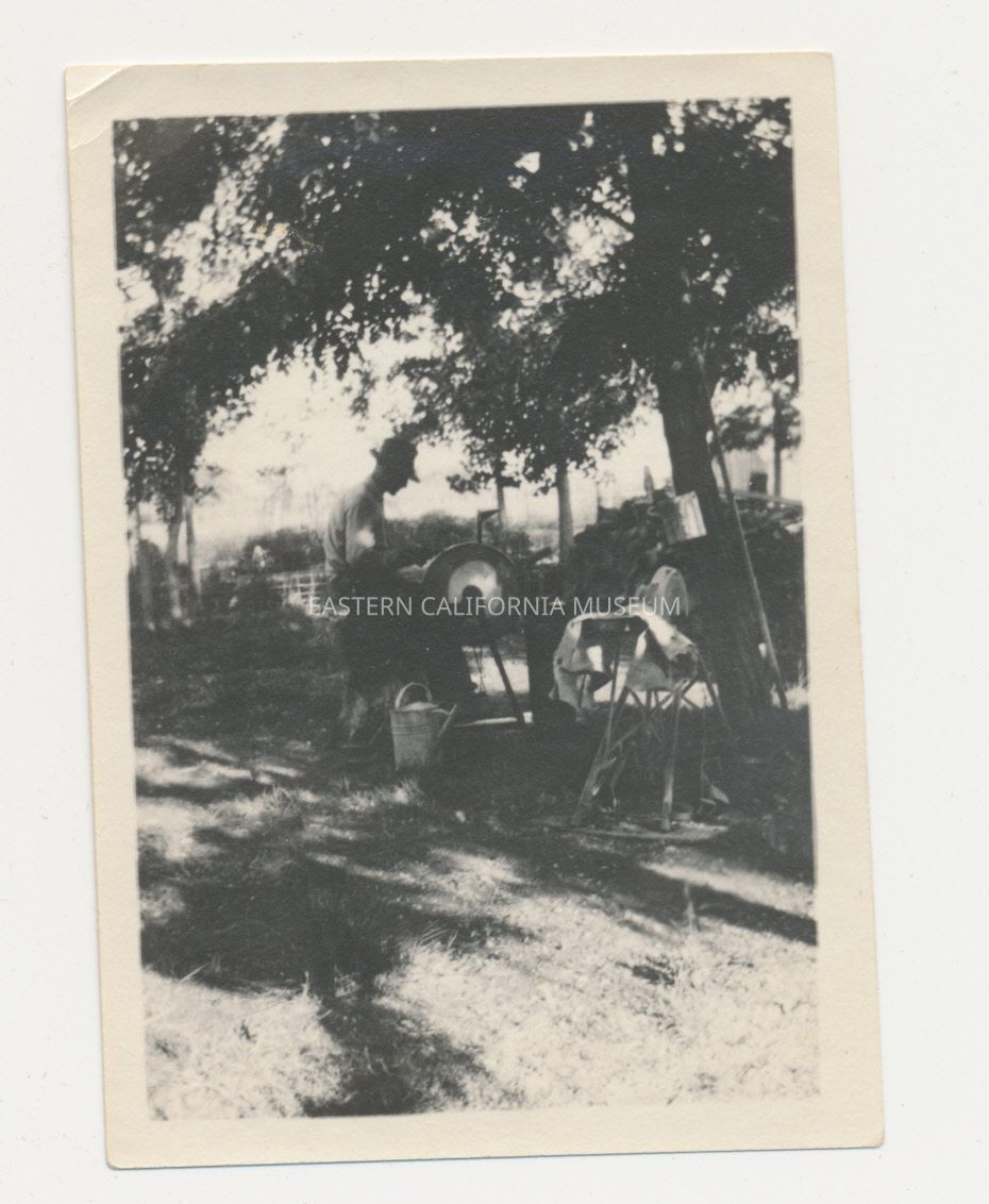 Photo of a man working outside in the shade of a tree at what may be a machine used for grinding or sharpening tools?