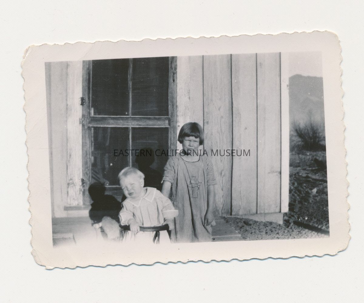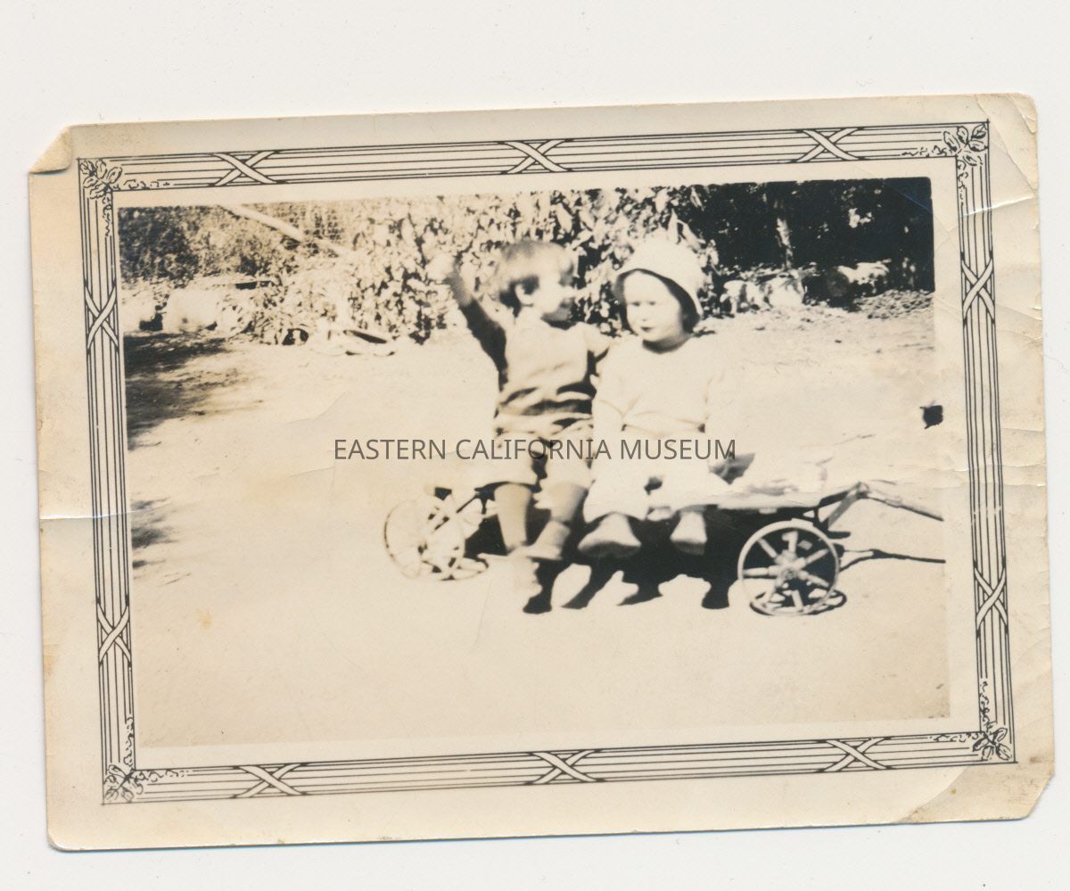 1991.13.1.124--Washed out photo of two children sitting on a toy wagon. Marie Francis Meyers and Marvin Donald Smith, September 1926. Marie 2 years, 2 months, Marvin 1 year, 9 months.
